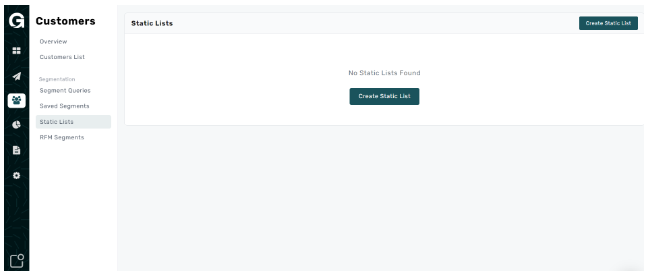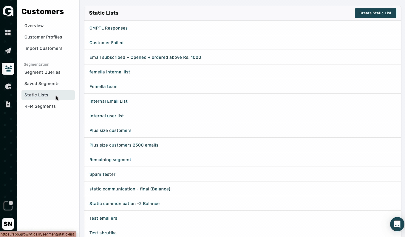 Navigate to Growlytics Dashboard > Customers > Static Lists > Create Static lists