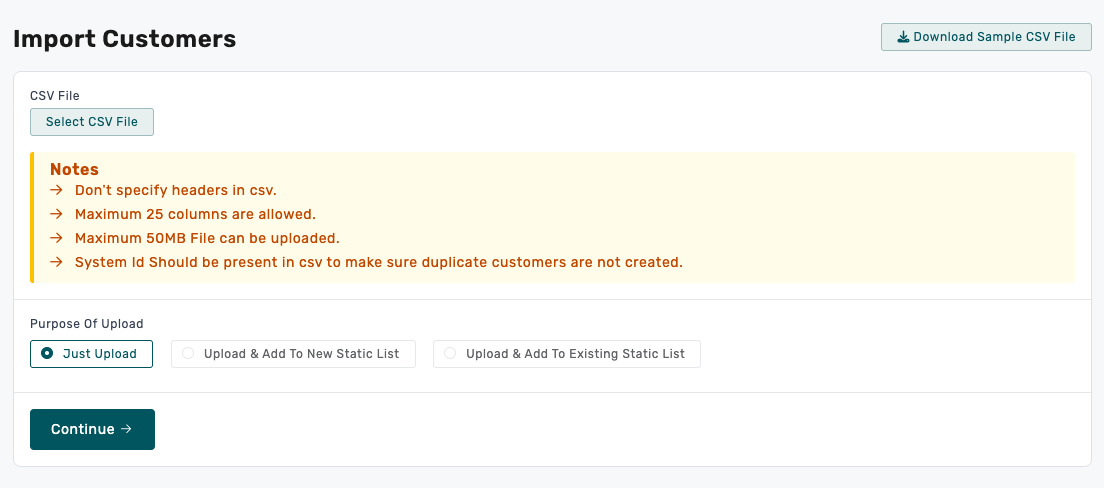 Click on Select File to Upload CSV > Purpose of Upload > Click on Continue