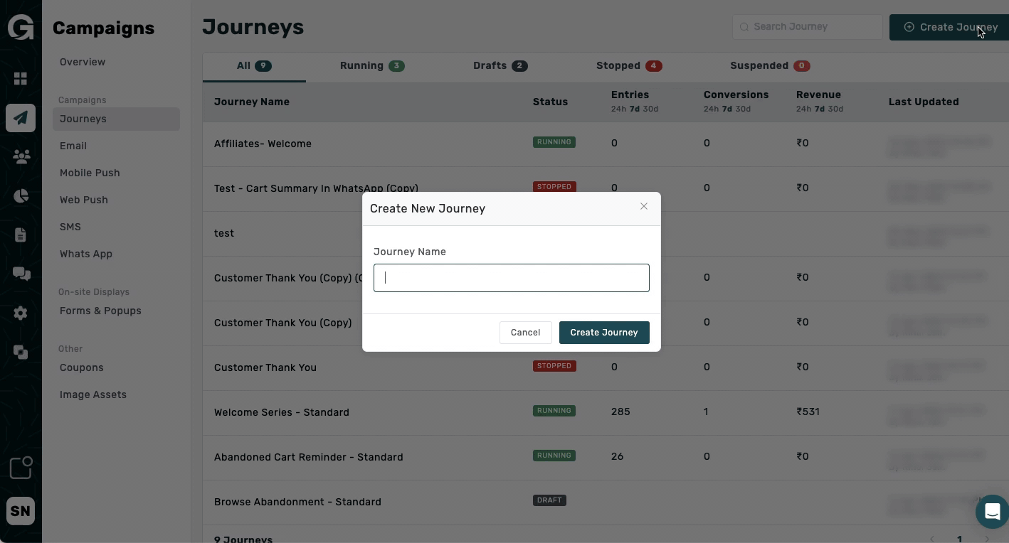 1. [Create](https://support.growlytics.in/journeys-and-automation/journeys-basics/create-a-journey) a journey.